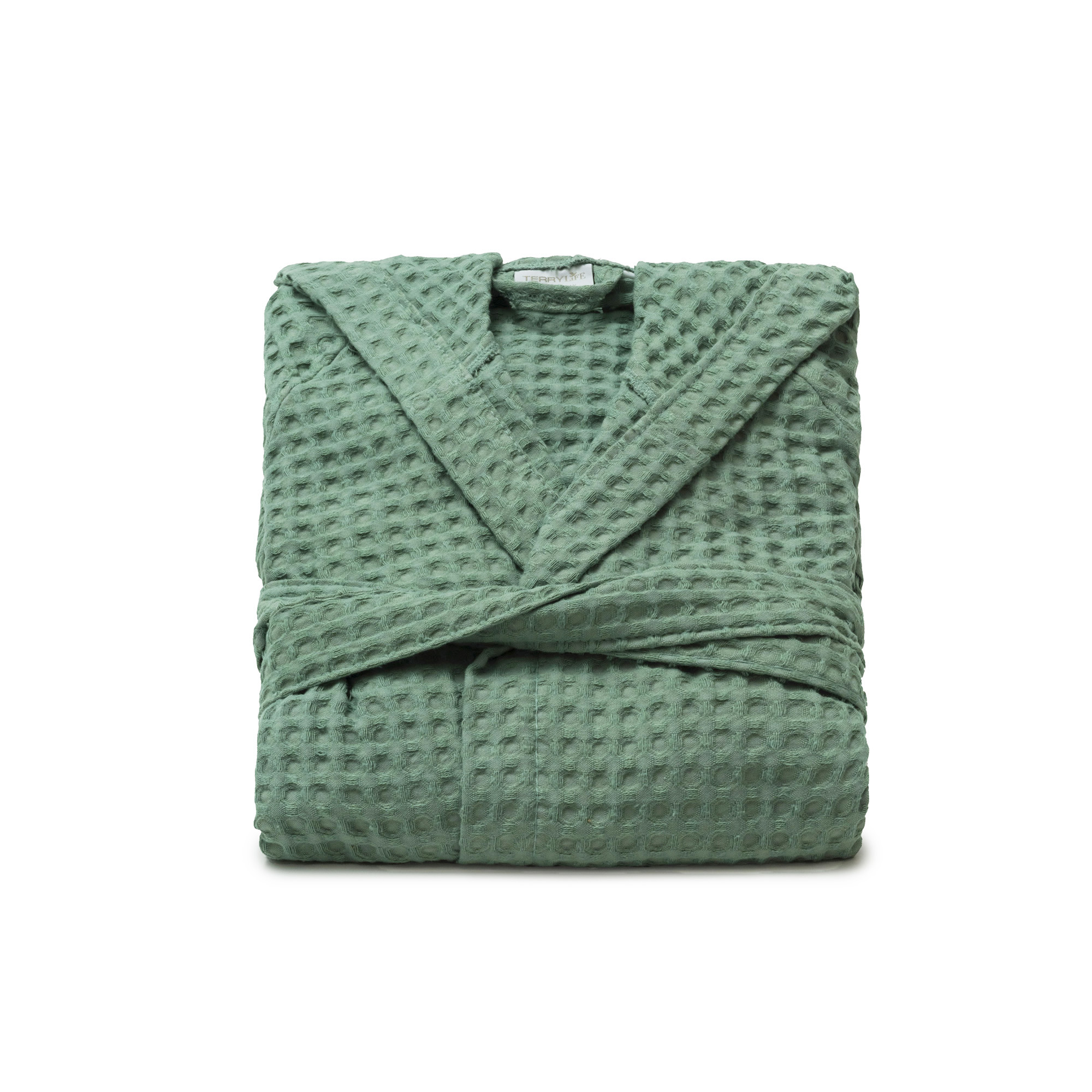 Accappatoio in Nido d'ape, morbido e assorbente nel colore salvia, dotato di cappuccio, due tasche laterali e cintura.