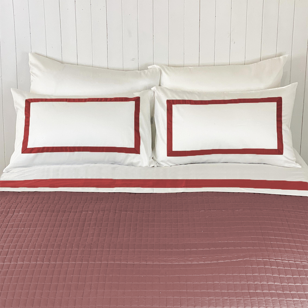 Questo Completo Lenzuola è realizzato in Raso 300 TC di puro Cotone, ed è formato da: lenzuolo sotto con angoli, lenzuolo sopra e due federe. Il modello Eiffel, adatto a vestire un letto moderno, ma anche classico, ha un bordo a cornice nel centro federa e un bordo in contrasto colore sulle lenzuola.