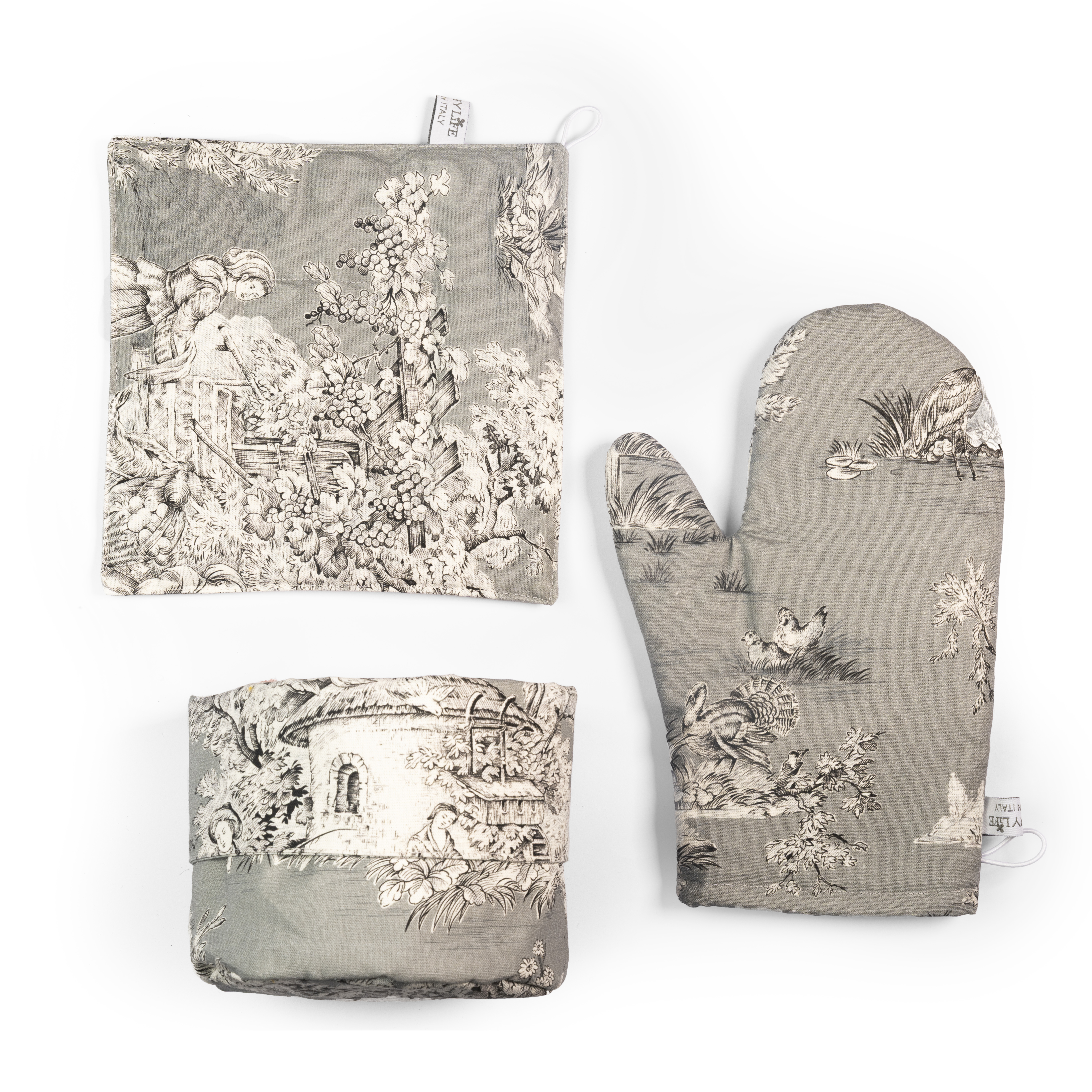Un set completo per chi ama cucinare con stile e sicurezza. Realizzato in 100% cotone, il kit unisce comfort, protezione e praticità: il guantone e la presina proteggono efficacemente dal calore, mentre il cestino è pensato per contenere e servire il pane o altri alimenti con raffinatezza e praticità